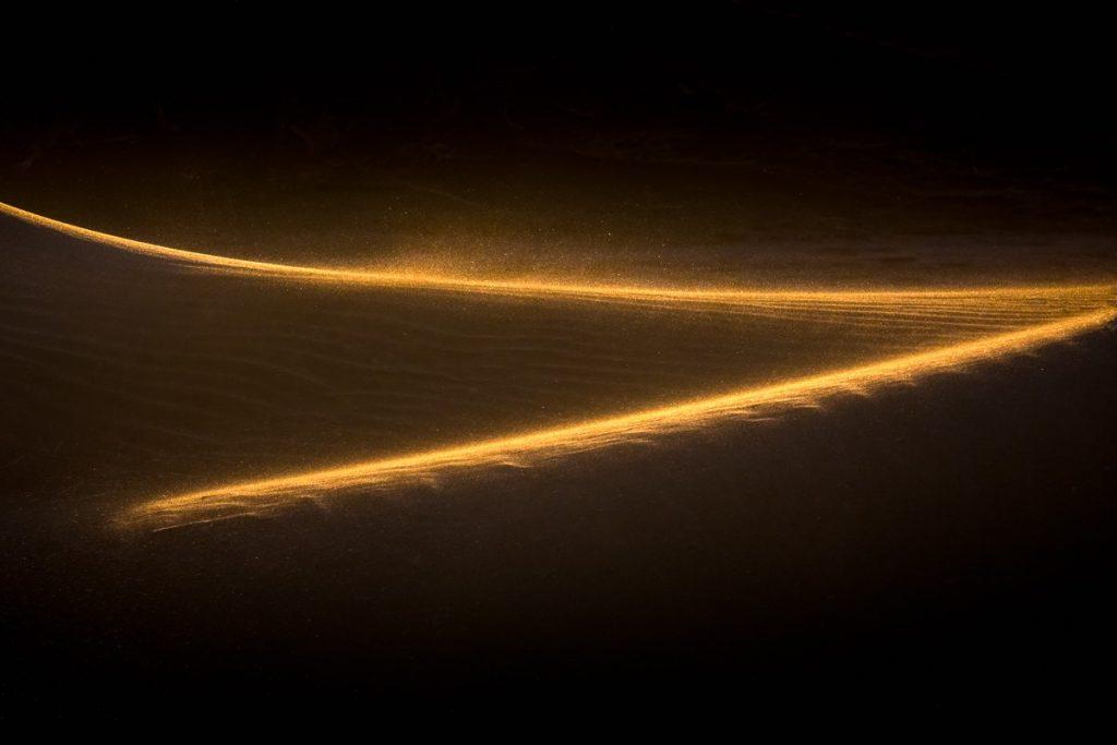 Ik ga vaak terug naar dezelfde plek tijdens een fotoreis. Op deze hele koude (-10 graden) ochtend bij Vestrahorn in IJsland waren er geen wolken en waaide het erg hard. Ik werd gezandstraald en dan is het fijn om twee camera’s te hebben met verschillende objectieven zodat je niet hoeft te wisselen van objectief. Ik vond de bergen en het landschap maar saai. Maar na mij te hebben gedraaid werd mijn interesse meteen getrokken door details. Dus meteen mijn andere camera met de 70-200mm gepakt om in te zoomen op het zwarte zand en het gouden randje dat door de zon wordt opgelicht. Door bewust onder te belichten gaat het in deze foto vooral om structuur, licht, en contrast. Het wolkje zand herinnert mij eraan hoe wreed de condities waren. O ja, als het dan zo hard waait, fotografeer dan lekker uit de hand met een snelle sluitertijd (1/1250s bij 200mm, iso 400 en f9).